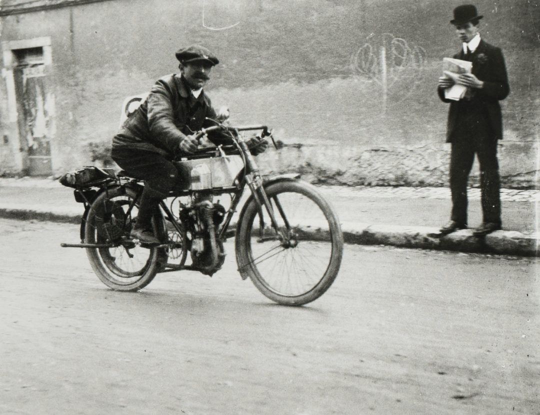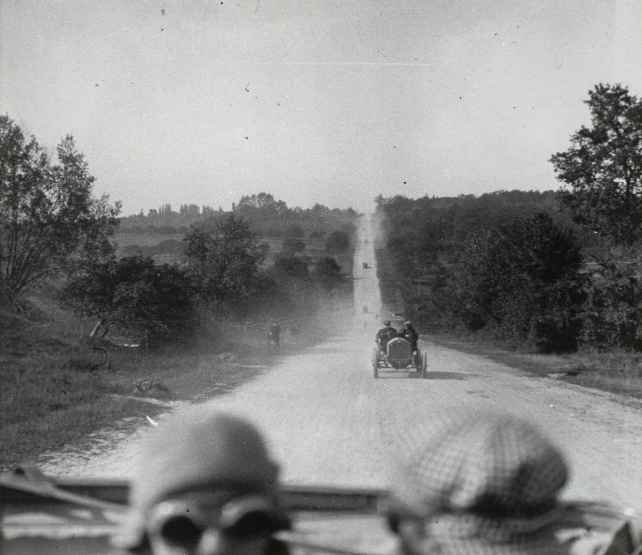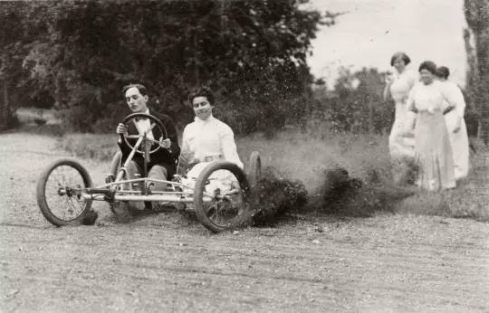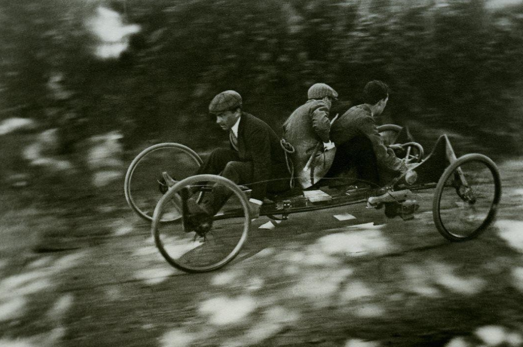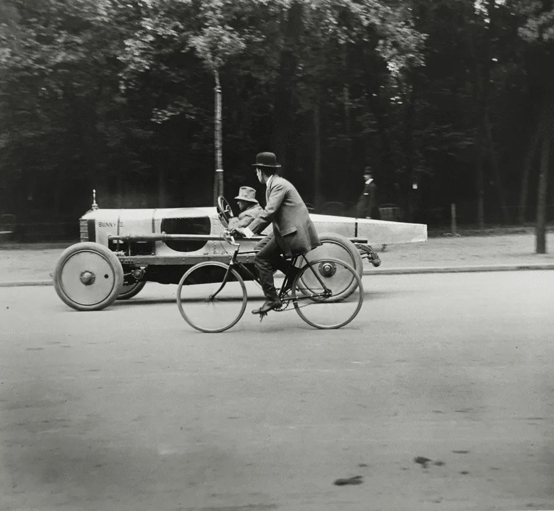 这个世界在永无止境地运动。无论是出于异想天开抑或是自视过高,拉蒂格的每一次奔跑试验,悉使用轮子或是翅膀以追求跑得更快、更远、更高。1912年,当他拍摄在A.C.F.格拉纳大奖赛(A.C.F.Grana Prix)中的德拉奇汽车(Delage Automobile)时,所有的事物都在移动:他焦平面快门上的一条窄缝同窗帘一般快速穿过成像平面,因此场景的某些部分比其他部分晚了零点几秒。画面中的观众似乎在倾斜,车轮亦变了形。拍摄另一辆赛车时,拉蒂格提出了一种新的方法,那就是在移动自己的同时保持相机不动:“我拍摄它[每小时行驶18公里]时,稍微旋转一圈,以保持它在视野中。这是我第一次如此去做。”