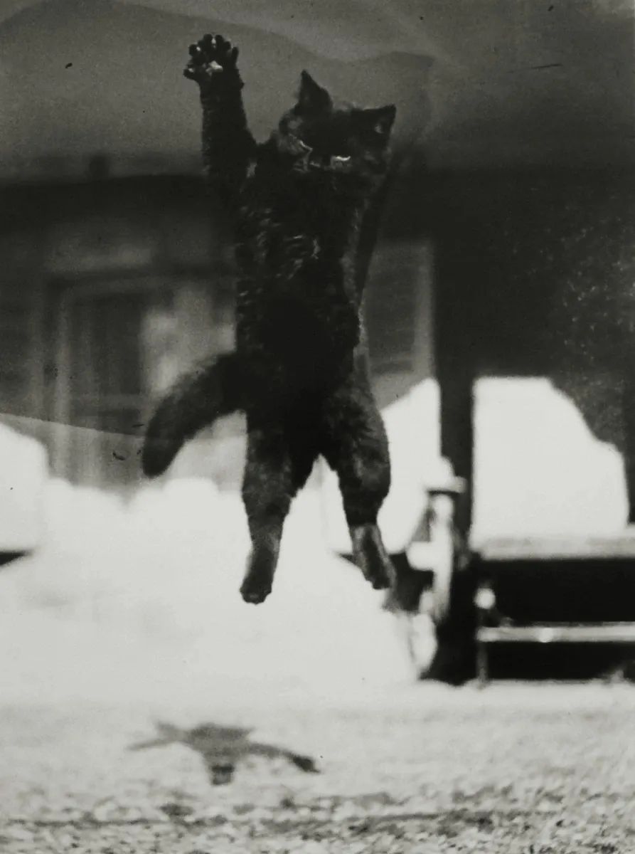 拉蒂格痴迷于那些稍纵即逝的瞬间,不忍时光白白流逝。猫纵身一跃;毫无防备的人冲下山坡;挑战失重:抛球、滑下楼梯、跳墙。他将那些流光瞬息凝固成了永恒:猫腾空而起;一架失控的滑翔机离开地面;身着长裙的女人在沙滩上奔跑,她的面纱和外衣随风舞动。拉蒂格享受这摄影背离万有引力定律的神奇瞬间。