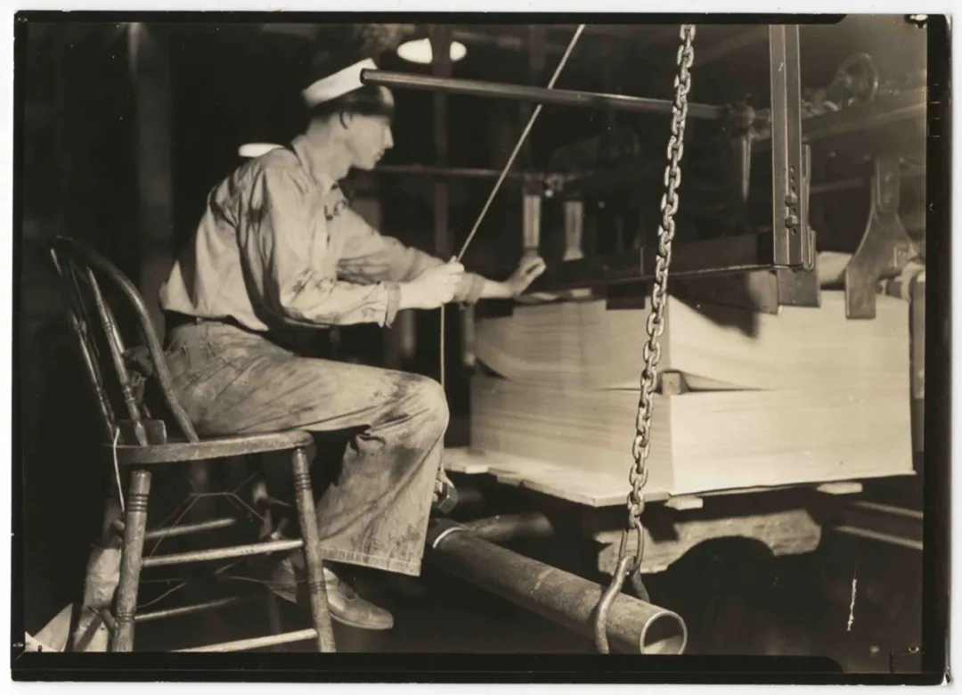这张照片拍摄于被卡罗莱纳州的贝塞麦市,一个11岁的童工在工厂做工时,一个机器掉下来砸到了他的脚,使他失去重心倒向传送带。毫无安全装置的机器的齿轮卷断了他的两根手指。