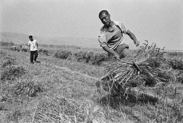 照相机不是镰刀,麦客也不是麦秆,我下不了狠心死手。摄影是一种观看方式,我就是这么一个“看法”。 我能用眼睛接住麦客的叹息吗?我能用叹息擦拭麦客的汗水吗?我能用汗水去饰掩无奈吗?或者,沙哑地呼唤生存力、生命力的现代再造?我不能为麦客的故事预期结尾,也不能为麦客的传说划上句号。我知道该为麦客“立此存照”。 麦客,是西北人的叫法,即在夏收时节相帮着乡民割麦的另一群乡民。麦客多来自于陕甘宁三省,流徙于关中东部,临潼至潼关诸县,渭河两岸及河川塬上。建国前,麦客们全靠脚力、体力、耐力,白天“赶场”顶烈日,晚上“转场”披星月,几十里路不在话下;建国后,随着交通条件的改变,他们再也不用百里千里地的步行赶场了;1980以后的麦客,人腕上戴着手表,扒火车、乘客车、坐汽车而来,并随着农村责任田的实行,麦客迎来了其黄金时代;1990年代开始,收割机逐渐抢占了麦客的地盘,麦客们的“规模经营”之势渐缩。 ——侯登科