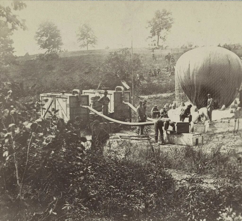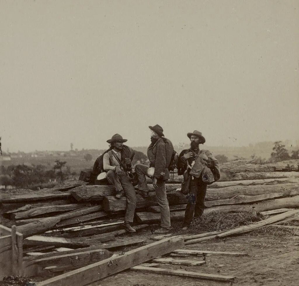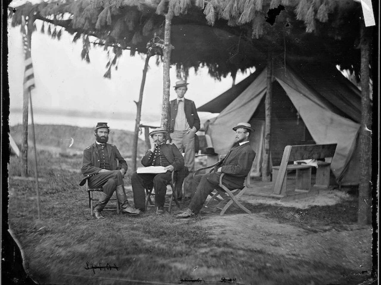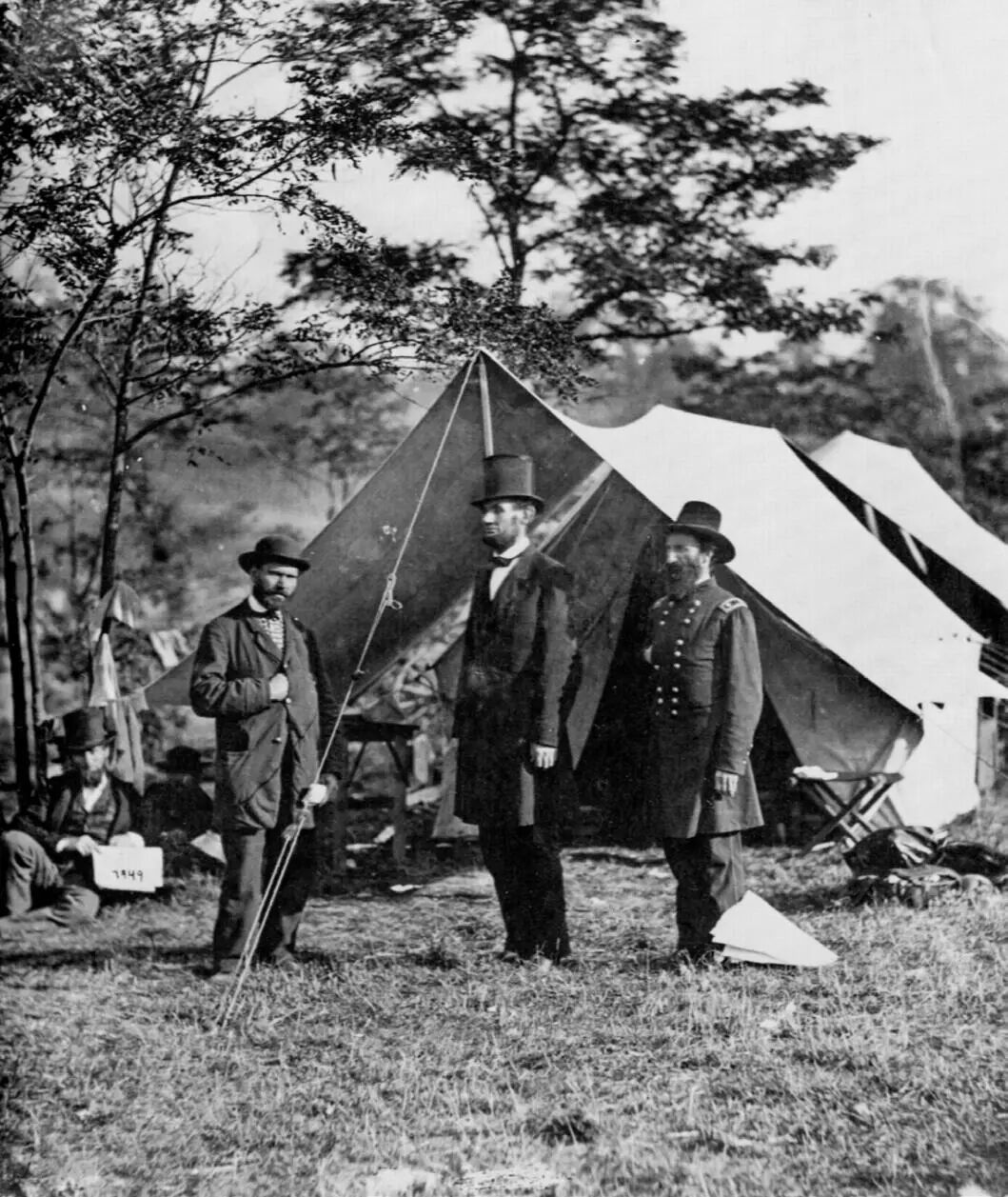 1862年10月3日,亚伯拉罕·林肯总统与侦探艾伦·平克顿(左)和约翰·麦克莱南德少将(右)。艾伦·平克顿(Allan Pinkerton)在战争期间担任联合情报服务部负责人,后来成立了著名的平克顿国家侦探社(Pinkerton National Detective Agency)↓