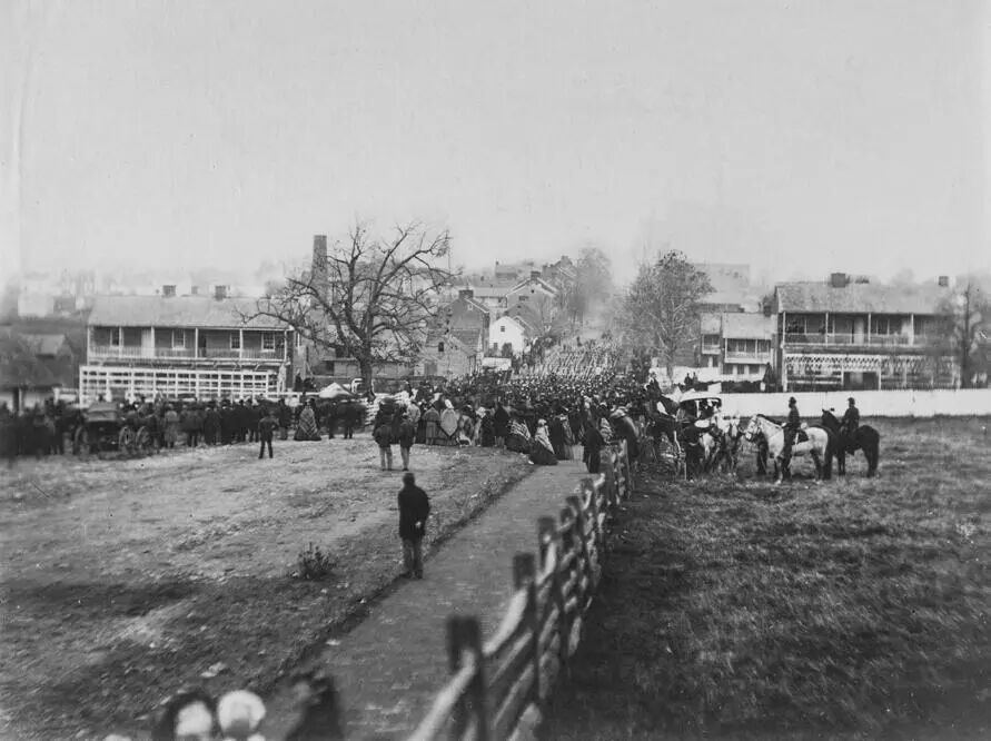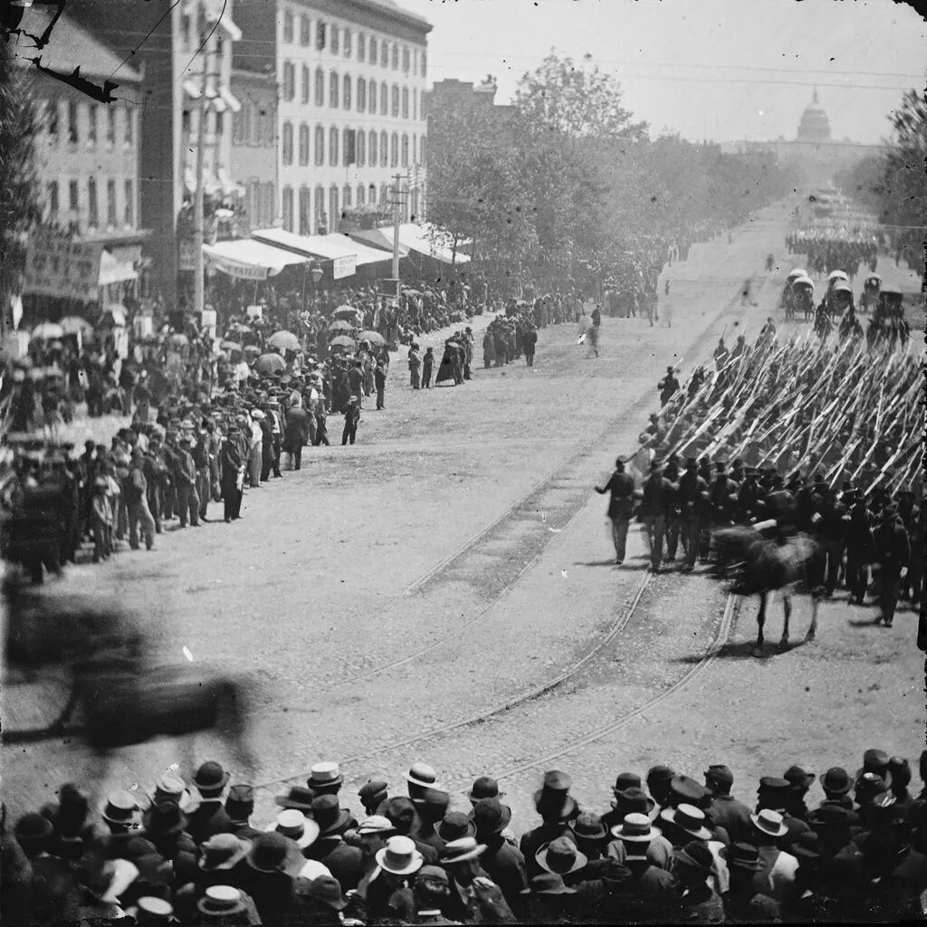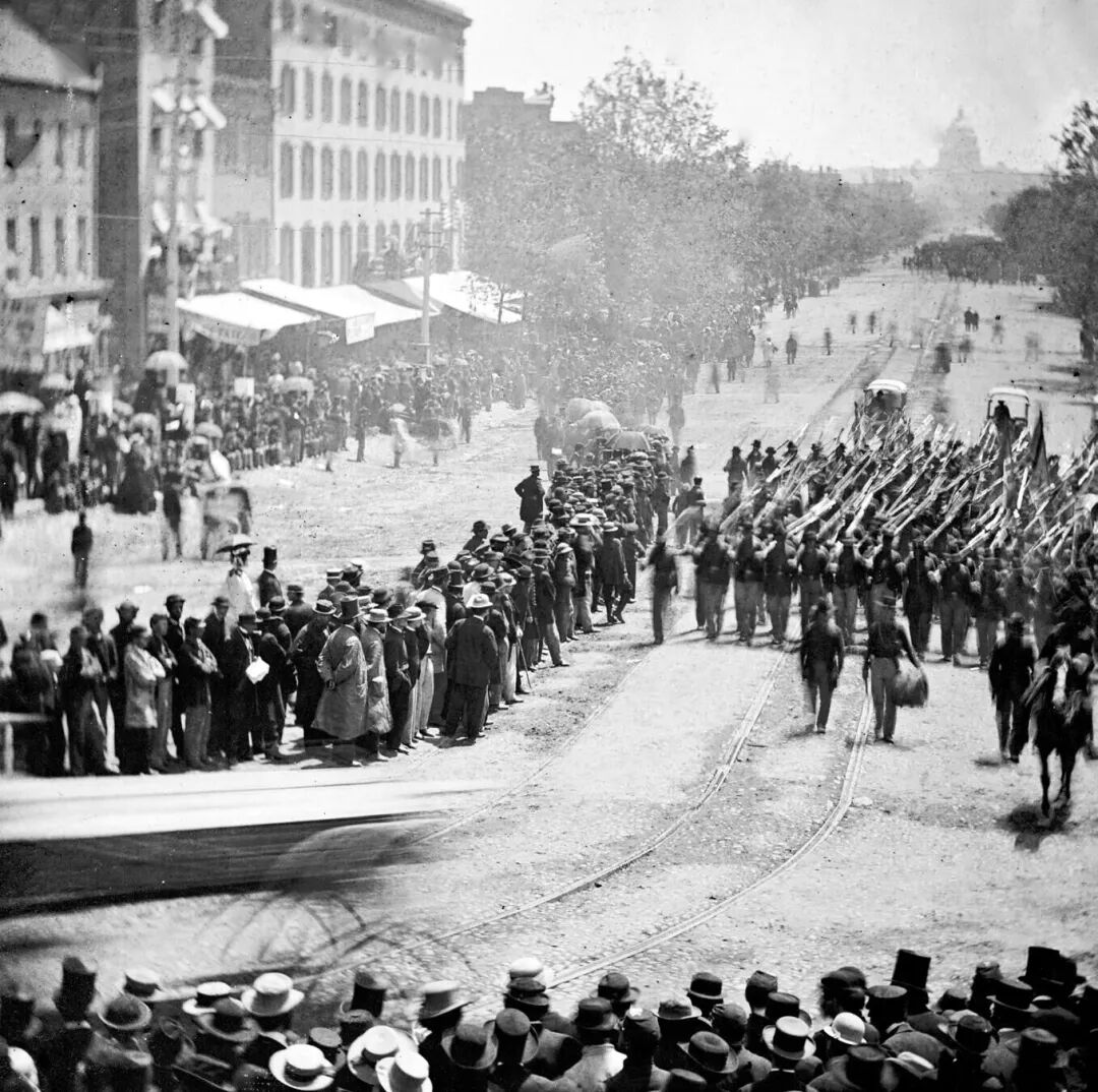 1865年5月,美国联邦军的“大检阅”现场,一支带着固定刺刀的内战步兵部队在华盛顿特区宾夕法尼亚大道行进,后面跟着救护车。↓